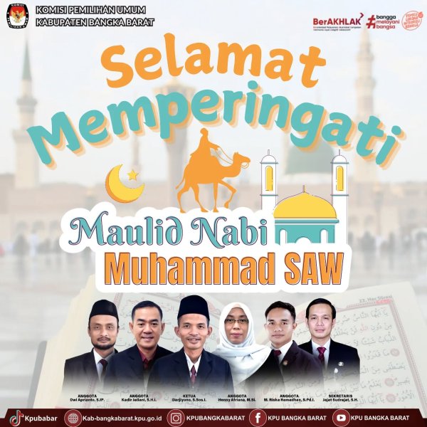 Maulid Nabi menjadi pengingat untuk selalu bershalawat dan menebar kebaikan. Komisi Pemilihan Umum (KPU) Kabupaten Bangka Barat mengucapkan Selamat Maulid Nabi Muhammad 1447 H / 2025.