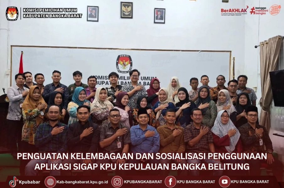 Komisi Pemilihan Umum (KPU) Kabupaten Bangka Barat menerima kunjungan KPU Provinsi Kepulauan Bangka Belitung dalam Rangka Penguatan Kelembagaan dan Sosialisasi Penggunaan Aplikasi SIGAP KPU Provinsi Kepulauan Bangka Belitung yang diwakili oleh Anggota KPU Provinsi Kepulauan Bangka Belitung yang juga Ketua Divisi Hukum dan Pengawasan, Muslim Ansori, bersama dengan Sekretaris KPU Provinsi Muchtaruddin serta jajaran staf sekretariat. KPU Provinsi Kepulauan Bangka Belitung melaksanakan Penguatan Kelembagaan dan Sosialisasi Aplikasi SIGAP di ruang rapat Kantor KPU Kabupaten Bangka Barat.