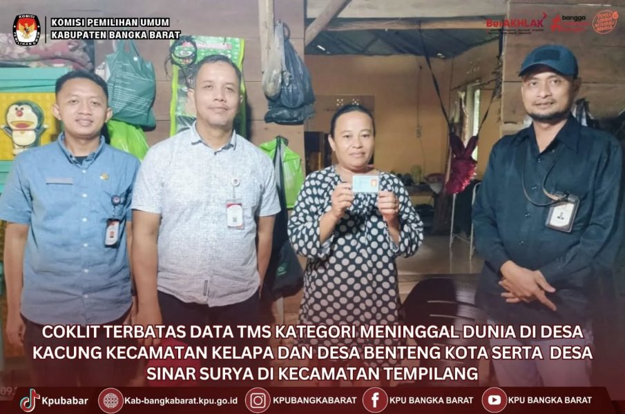 Ketua Divisi Perencanaan, Data dan Informasi Komisi Pemilihan Umum (KPU) Kabupaten Bangka Barat Bapak Dwi Aprianto, S.IP bersama Kasubbag dan Staf melaksanakan Coklit Terbatas (COKTAS) terhadap Data Pemilih tidak memenuhi syarat (TMS) kategori meninggal dunia di Desa Kacung Kecamatan Kelapa dan Desa Benteng Kota serta Desa Sinar Surya di kecamatan Tempilang.