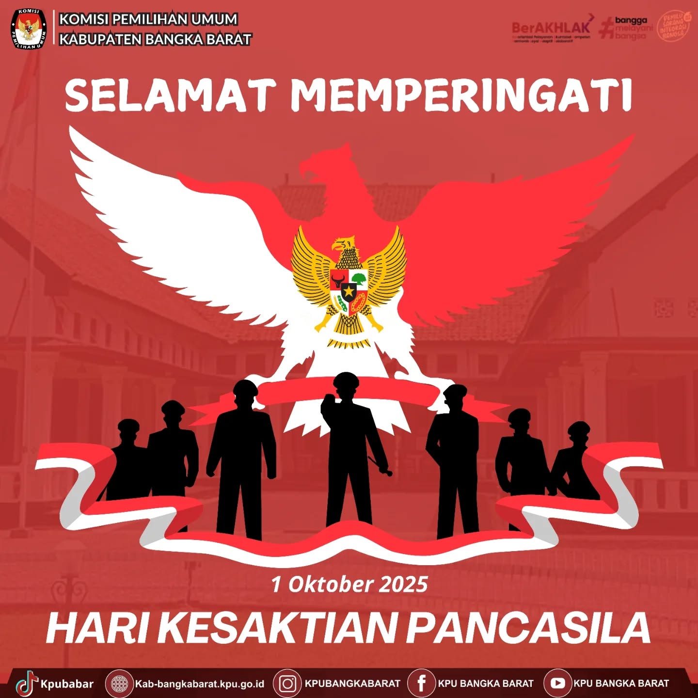 kenanglah para pahlawan yang menjaga ideologi, karena dari mereka kita belajar arti keberanian sejati. Komisi Pemilihan Umum (KPU) Kabupaten Bangka Barat mengucapkan Selamat Hari Kesaktian Pancasila 1 Oktober 2025.