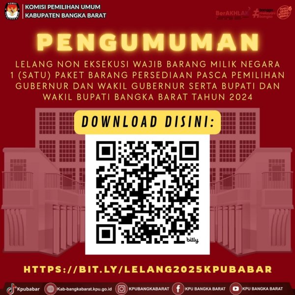 Komisi Pemilihan Umun (KPU) Kabupaten Bangka Barat membuka lelang non eksekusi wajib barang milik negara 1 (satu) paket barang persediaan pasca Pemilihan Gubernur dan Wakil Gubernur serta Bupati dan Wakil Bupati Bangka Barat Tahun 2024.