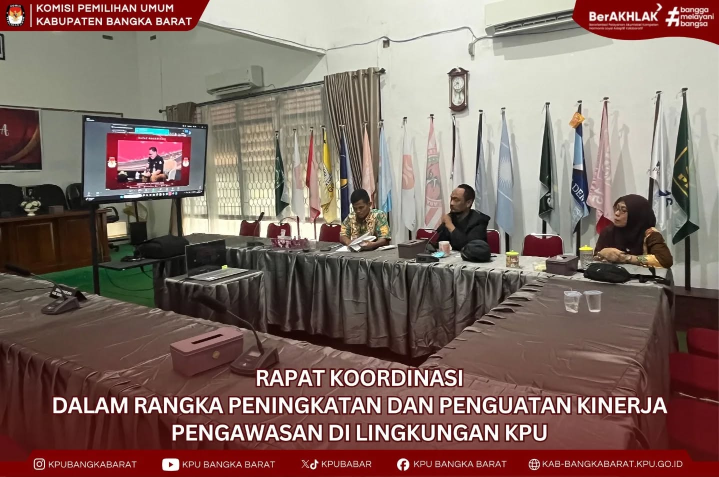 Selasa (21/10/2025) Komisi Pemilihan Umum (KPU) Kabupaten Bangka Barat mengikuti kegiatan Rapat Koordinasi (Rakor) dalam rangka peningkatan dan penguatan kinerja pengawasan di lingkungan KPU melalui zoom meeting diruang rapat KPU Kabupaten Bangka Barat, Mentok.
