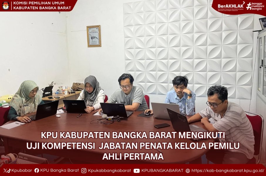 Sebanyak 5 orang pelaksana dari Komisi Pemilihan Umum (KPU) Kabupaten Bangka Barat mengikuti Pelaksanaan Uji Kompetensi (Ujikom) Penata Kelola Pemilu Ahli Pertama yang diselenggarakan oleh Sekretariat Jenderal Komisi Pemilihan Umum Republik Indonesia,