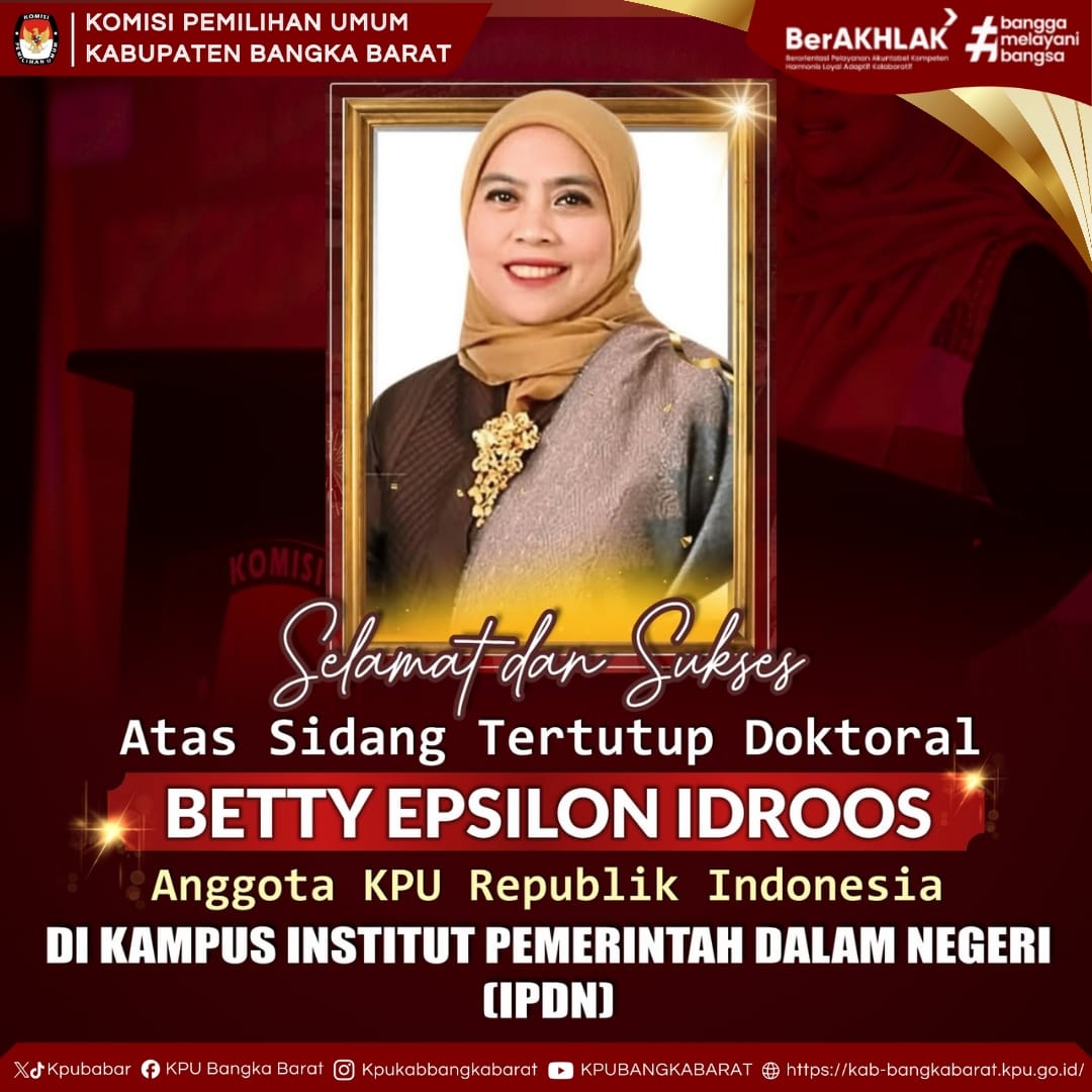 Komisi Pemilihan Umum Kabupaten Bangka Barat Mengucapkan Selamat dan Sukses atas Sidang Tertutup Doktoral Ibu Betty Epsilon Idroos (Anggota KPU Republik Indonesia) di Kampus Institut Pemerintahan Dalam Negeri.