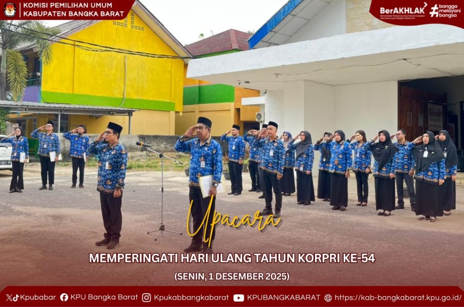 Mentok — Komisi Pemilihan Umum (KPU) Kabupaten Bangka Barat melaksanakan Upacara dalam rangka memperingati Hari Ulang Tahun Korps Pegawai Republik Indonesia (KORPRI) ke-54 di Halaman Kantor KPU Kabupaten Bangka Barat, Senin (1 Desember 2025).