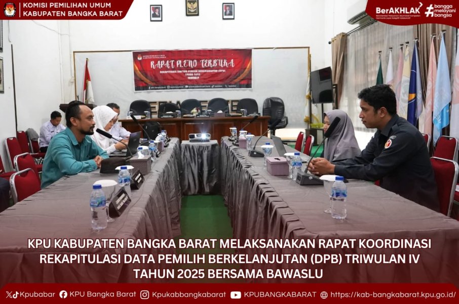 Mentok — Komisi Pemilihan Umum (KPU) Kabupaten Bangka Barat menggelar rapat koordinasi rekapitulasi Data Pemilih Berkelanjutan (DPB) bersama Bawaslu Kabupaten Bangka Barat di ruang rapat Kantor KPU Bangka Barat Senin pagi (8/12/2025).
