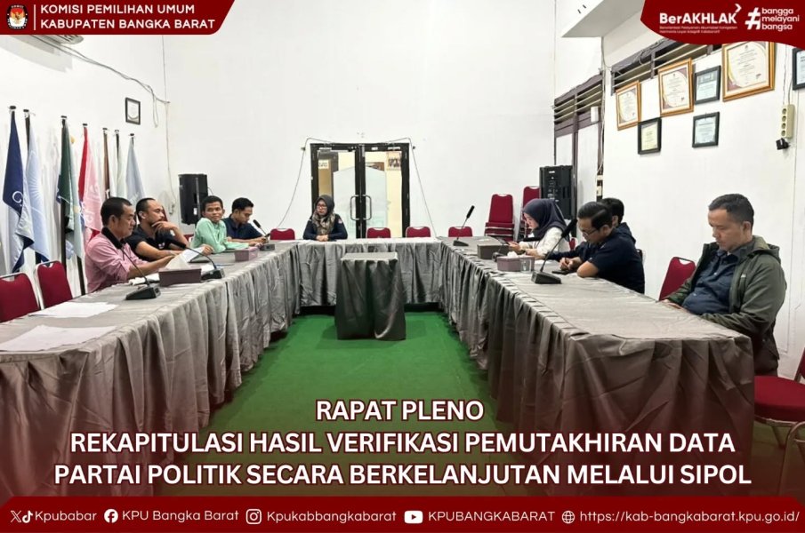 Mentok — Komisi Pemilihan Umum (KPU) Kabupaten Bangka Barat melaksanakan Rapat Pleno Rekapitulasi Hasil Pemutakhiran Data Partai Politik secara berkelanjutan melalui Sistem Informasi Partai Politik (SIPOL), bertempat di Kantor KPU Kabupaten Bangka Barat, Selasa (30/12/2025).