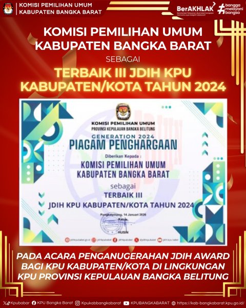 Komisi Pemilihan Umum (KPU) Kabupaten Bangka Barat berhasil meraih Penghargaan Terbaik III Jaringan Dokumentasi dan Informasi Hukum (JDIH) KPU Kabupaten/Kota Tahun 2024 pada Acara Penganugerahan JDIH Award bagi KPU Kabupaten/Kota di Lingkungan KPU Provinsi Kepulauan Bangka Belitung.