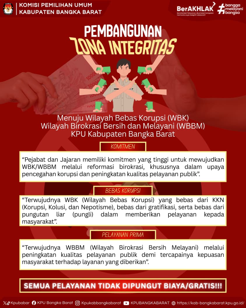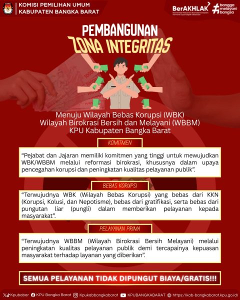 Melalui upaya berkelanjutan menuju Wilayah Bebas dari Korupsi (WBK) dan Wilayah Birokrasi Bersih dan Melayani (WBBM), KPU Kabupaten Bangka Barat berkomitmen melakukan pencegahan korupsi serta meningkatkan kualitas pelayanan publik.
