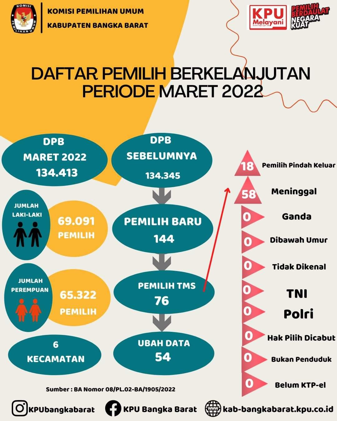Hari ini, Kamis tanggal 24 Maret 2022 KPU Kabupaten Bangka Barat menetapkan Hasil Pemutakhiran Daftar Pemilih berkelanjutan Periode Maret Tahun 2022. Hasil Rekapitulasi Daftar Pemilih Berkelanjutan (DPB) Kabupaten Bangka Barat periode Maret 2022 adalah 134.413 pemilih dengan rincian 69.091 pemilih laki-laki dan 65.322 pemilih perempuan. Jumlah ini diperoleh dari DPB bulan sebelumnya (Februari 2022) yang berjumlah 134.345 pemilih ditambahkan 144 pemilih baru dan dikurangi pemilih Tidak Memenuhi Syarat (TMS) sejumlah 76 pemilih, dan pemilih ubah data sejumlah 54 pemilih.