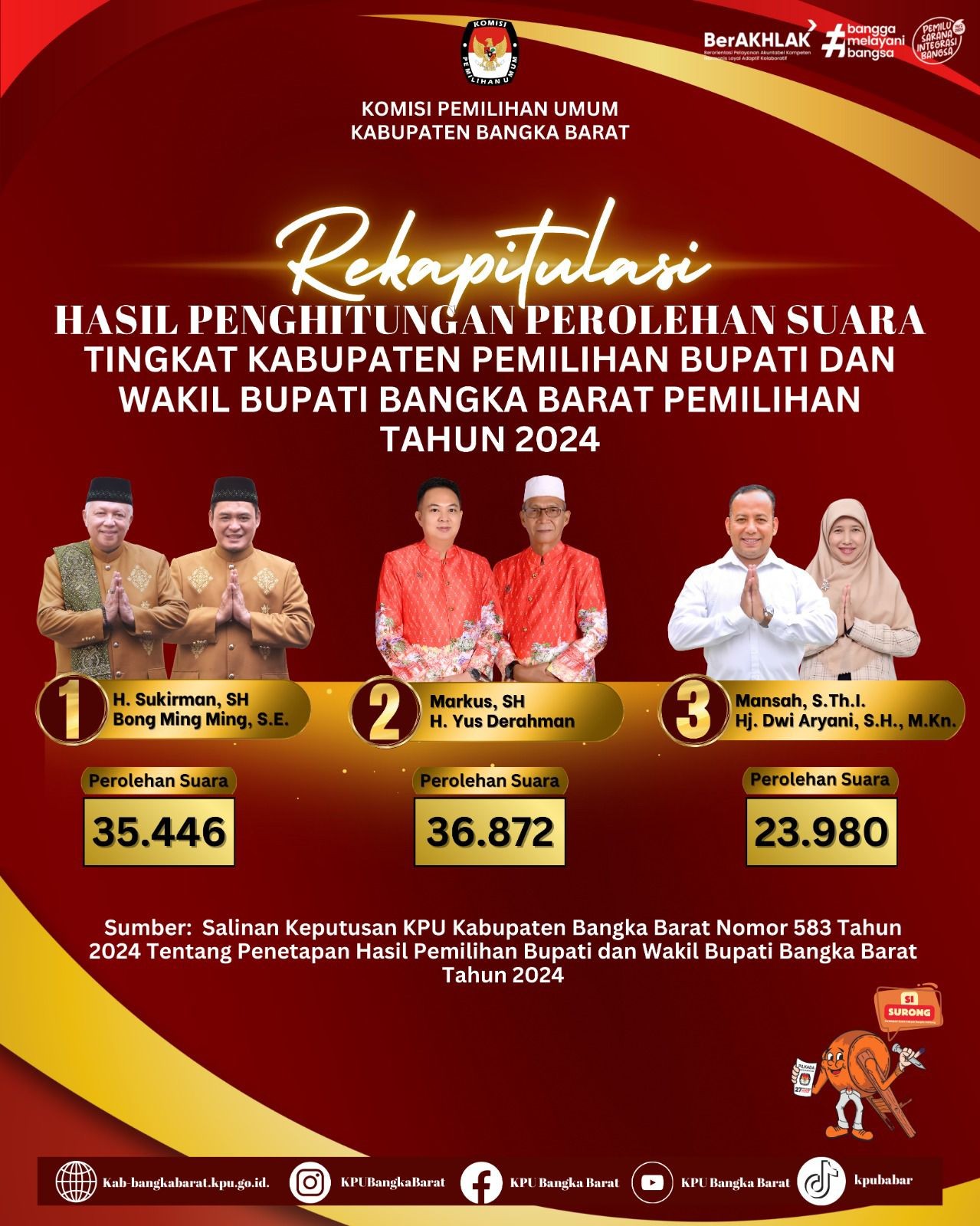 Berdasarkan Keputusan Komisi Pemilihan Umum Kabupaten Bangka Barat Nomor 583 Tahun 2024 Tentang Penetapan Hasil Pemilihan Bupati dan Wakil Bupati Bangka Barat Tahun 2024.