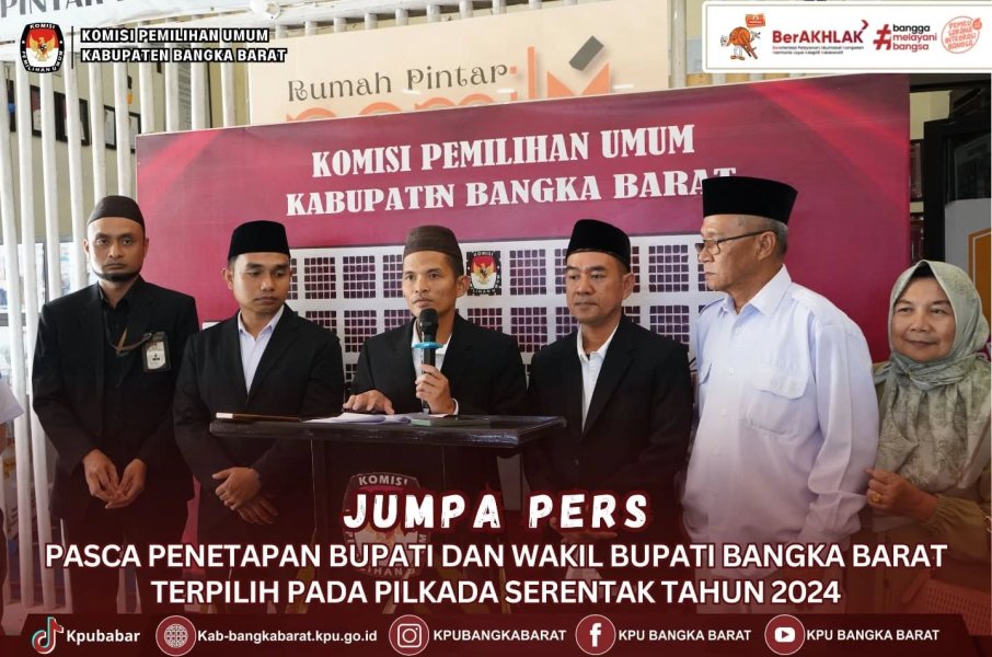 Komisi Pemilihan Umum (KPU) Kabupaten Bangka Barat telah melaksanakan Jumpa Pers Pasca Penetapan Bupati dan Wakil Bupati Bangka Barat terpilih pada Pilkada Serentak Tahun 2024 di Kantor KPU Kabupaten Bangka Barat.