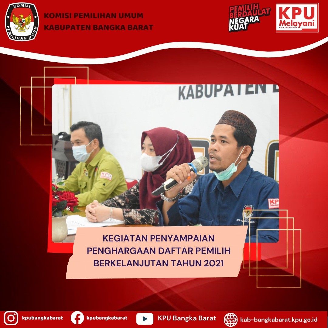 Hari ini Selasa 15 Februari 2022, KPU Kabupaten Bangka Barat melaksanakan kegiatan Penyampaian Penghargaan Daftar Pemilih Berkelanjutan Tahun 2021 yang dilaksanakan secara daring. kegiatan yang dimulai pukul 09.00 WIB ini diikuti oleh KPU Provinsi Kepulauan Bangka Belitung, Ketua dan anggota Bawaslu Kab. Bangka Barat, Kepala Dinas Kependudukan dan Pencatatan Sipil Kabupaten Bangka Barat, UPT Dinas Pendidikan Regional V Bangka Barat, Perwakilan Rutan Kelas II B Muntok, Perwakilan dari Kantor Kementerian Agama Bangka Barat serta seluruh Pemerintahan Desa/ Kelurahan se- Bangka Barat.