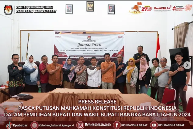 Jum'at, 28 Februari 2025-Komisi Pemilihan Umum Kabupaten Bangka Barat menggelar kegiatan PRESS RELEASE bersama para awak media (Pers) di ruang rapat Kantor KPU Kabupaten Bangka Barat. Kegiatan ini merupakan bentuk penyampaian pernyataan resmi pihak KPU Kabupaten Bangka Barat terkait tindak lanjut pasca Putusan Mahkamah Konstitusi Republik Indonesia dalam Pemilihan Bupati dan Wakil Bupati Bangka Barat Tahun 2024.