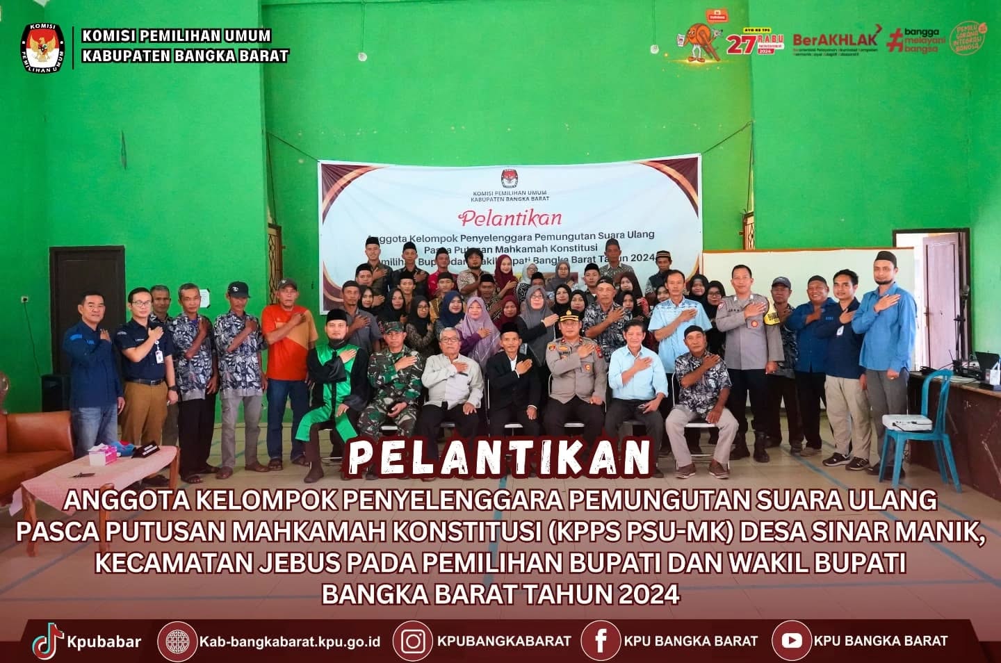 Ketua Komisi Pemilihan Umum Kabupaten Bangka Barat, Bapak Darjiyono, S.Sos.I telah selesai melakukan Pelantikan terhadap 28 orang Anggota Kelompok Penyelenggara Pemungutan Suara Ulang Pasca Putusan Mahkamah Konstitusi (KPPS PSU-MK) Desa Sinar Manik, Kecamatan Jebus pada Pemilihan Bupati dan Wakil Bupati Bangka Barat Tahun 2024.