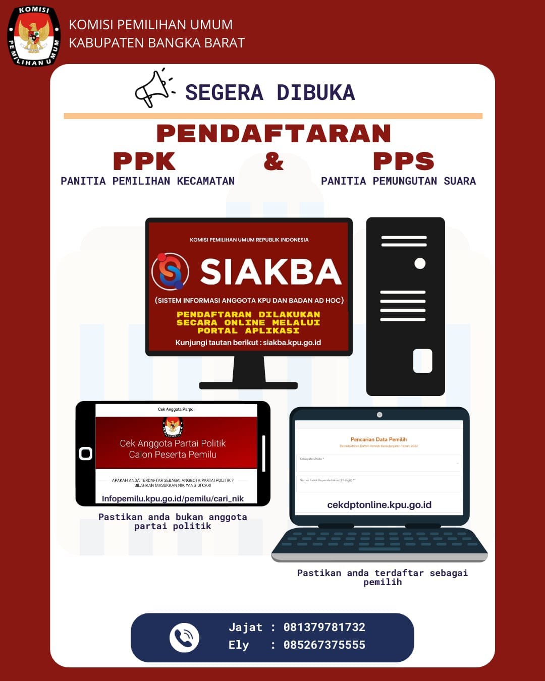 KPU Kabupaten Bangka Barat membuka kesempatan sebesar-besarnya bagi putera puteri terbaik Bangka Barat untuk menjadi Penyelenggara dalam Pemilihan Umum 2024 di Kecamatan dan Desa*. Pendaftaran dimulai pada 16 November 2022 melalui aplikasi berikut ini: https://siakba.kpu.go.id/