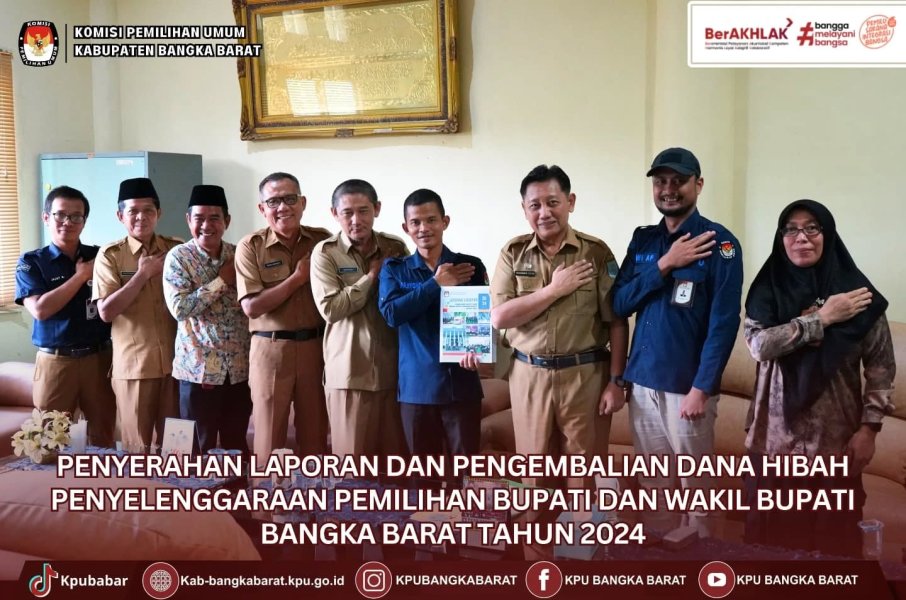 Komisi Pemilihan Umum (KPU) Kabupaten Bangka Barat melakukan penyerahan Laporan Pertanggungjawaban Penggunaan Dana Hibah dan Pengembalian sisa Dana Hibah Penyelenggaraan Pemilihan Bupati dan Wakil Bupati Bangka Barat Tahun 2024.
